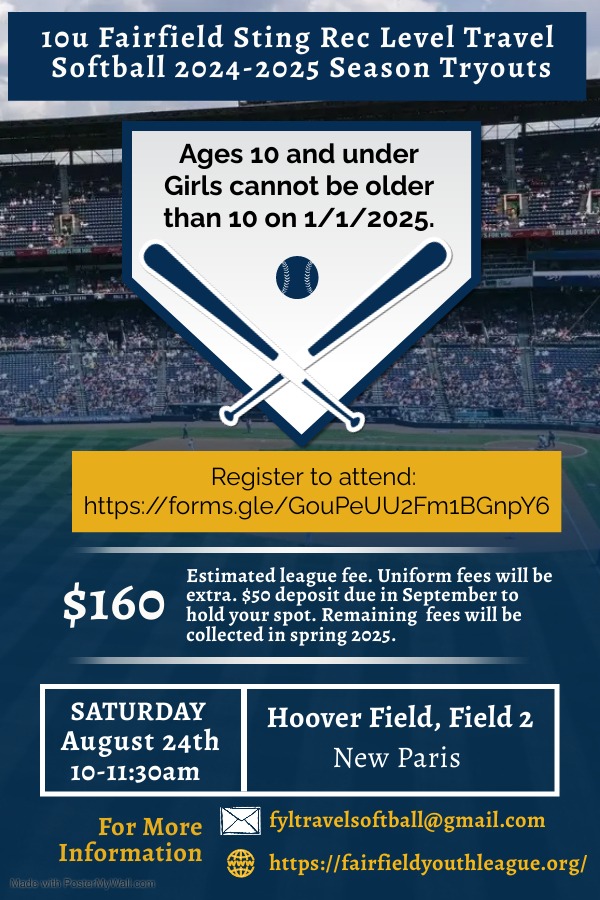 10u softball tryouts for next season. This ia a rec level program and the player must also participate in the FYL in-house league. For planning purposes, use this form to register: https://forms.gle/GouPeUU2Fm1BGnpY6